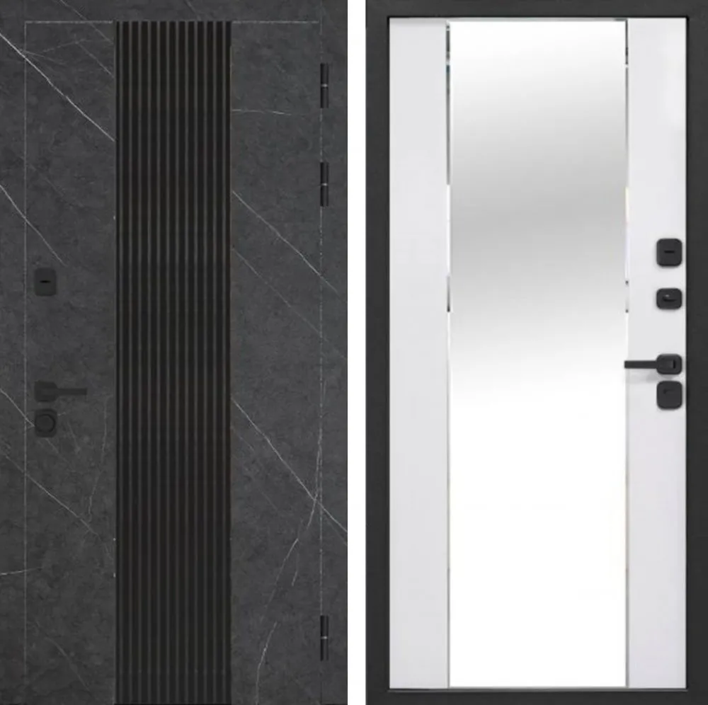Металл: Порошково-полимерное покрытие, цвет Муар черный с блестками 9005 Отделка снаружи: Лист стали + ламинированная МДФ панель 12 мм, вставка цвет Антрацит софт, цвет панели Мрамор графитовый